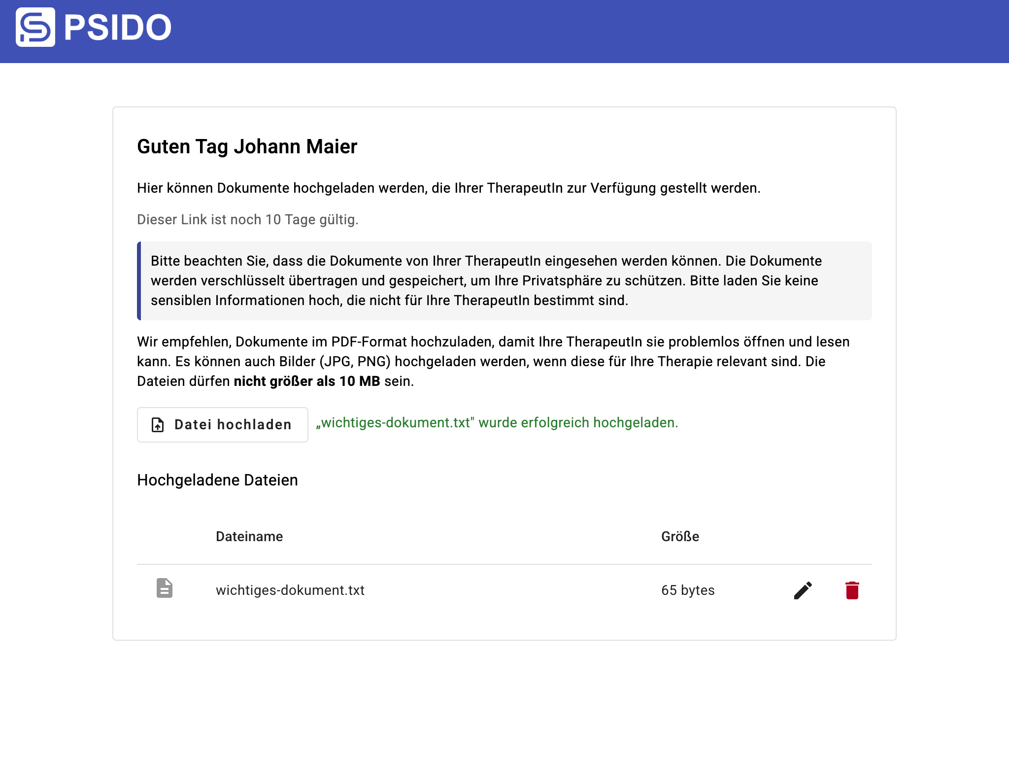 Ihre Patient:in erhält eine E-Mail mit einem sicheren Link und kann die angeforderten Dokumente hochladen. Dieser Link ist für 10 Tage gültig. Ihre Patient:in benötigt dafür kein Psido-Konto und keine Anmeldung – der Link funktioniert direkt im Browser.